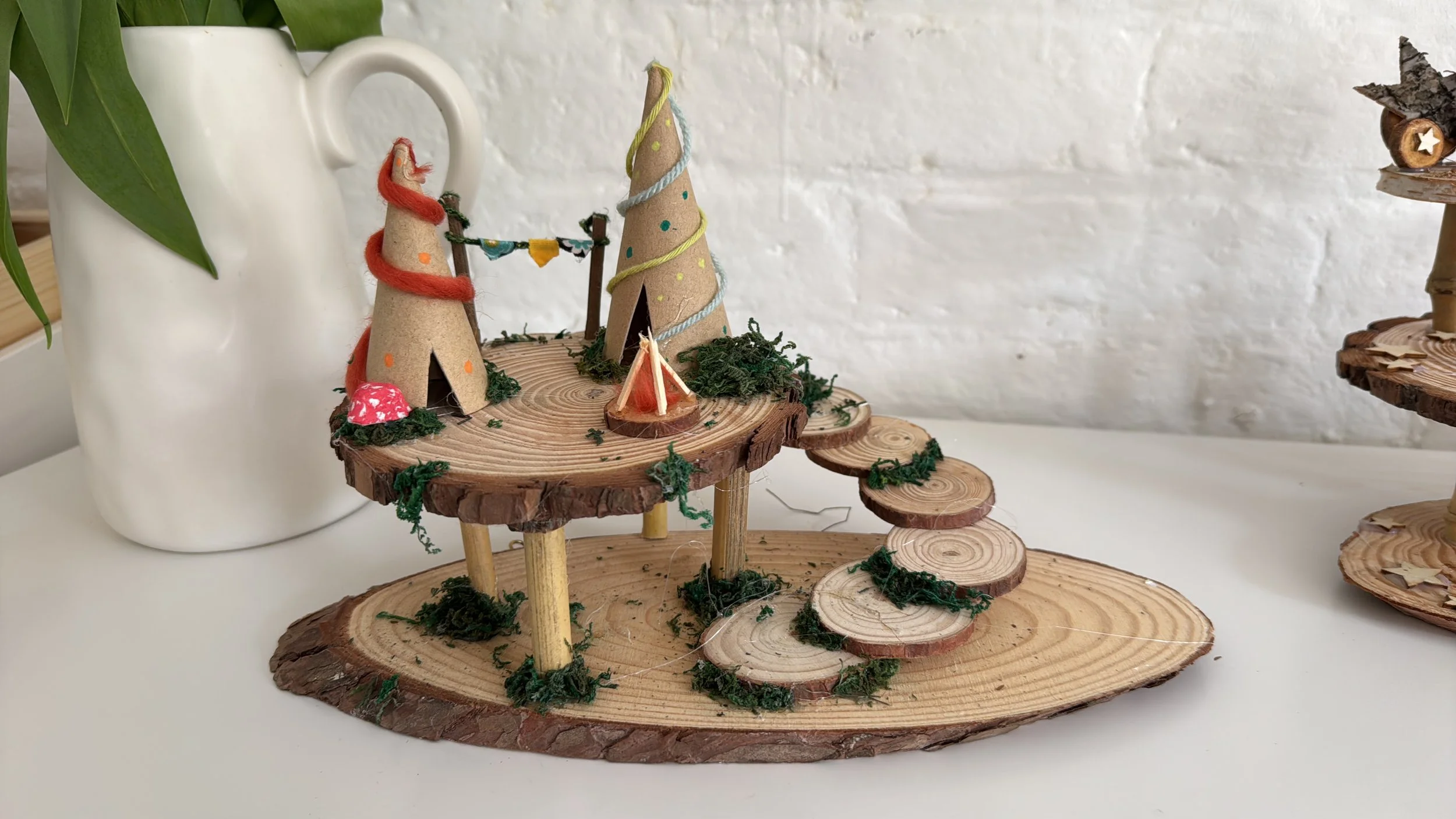 Made using log slices, moss and found twigs, this tiny campsite was imagined and built over two sessions - a peaceful woodland rest stop for fairies.